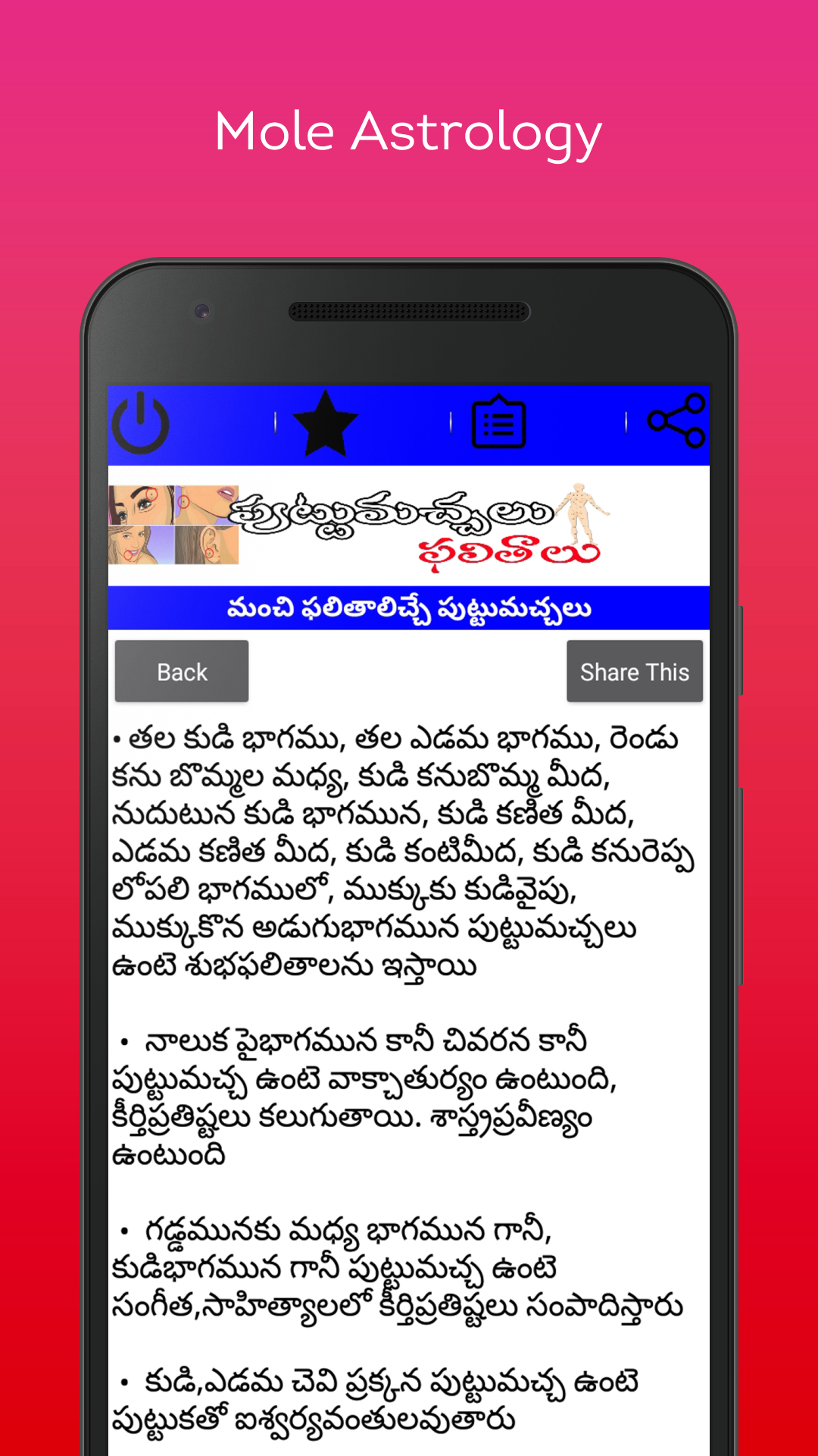 Moles Astrology In Telugu - Heaven's Child Apr 20, 2018 · Moleosophy or moleomancy or mole astrology is a technique of divination and fortune telling based upon the observation and interpretation of bodily marks — primarily those of the melanocytic nevus condition - This app built for knowledge - This app created in telugu language - Mole astrology is a believable subject - if you ...